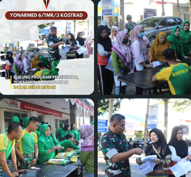 Menindak lanjuti perintah tersebut Yonarmed 6 berkolaborasi dengan Perum Bulog Kancab Makassar melaksanakan Bazar Beras Murah yang bertempat didepan Koperasi Yonarmed 6/Tamarunang, hal ini mendapat respons positif dari masyarakat ditandai dengan waktu penjualan yang sangat singkat, hanya dalam waktu 2 Jam beras sebanyak 4 Ton telah diborong habis oleh masyarakat. (Selasa, 5/08/2025)
