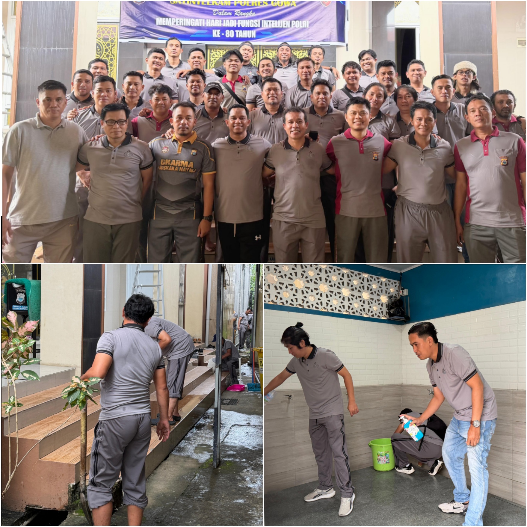 Dalam rangka memperingati Hari Jadi Fungsi Intelijen Polri ke-80 Tahun, Satuan Intelkam Polres Gowa melaksanakan kegiatan bakti sosial berupa kerja bakti membersihkan lingkungan sekitar Mako Polres Gowa serta Masjid Al Gaffar Polres Gowa, pada (Selasa,30/12/2025).