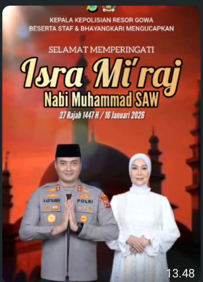 TarunaNews.id Kepala Kepolisian Resor Gowa AKBP Muhammad Aldy Sulaiman, S.I.K., M.Si, beserta seluruh staf dan Bhayangkari Cabang Gowa menyampaikan ucapan Selamat Memperingati Isra Mi’raj Nabi Muhammad SAW 27 Rajab 1447 Hijriah / 16 Januari 2026 kepada seluruh umat Islam, khususnya di Kabupaten Gowa, Jum’at (16/1/2026).