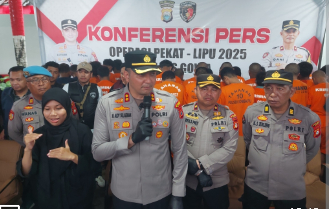 tarunanews.id/ Kapolres Gowa, AKBP Muh. Aldy Sulaiman, S.I.K., M.Si, memimpin langsung jalannya konferensi pers terkait rilis hasil Operasi Penyakit Masyarakat (PEKAT) LIPU 2025 yang digelar di halaman Mapolres Gowa pada Jumat (23/5/2025).