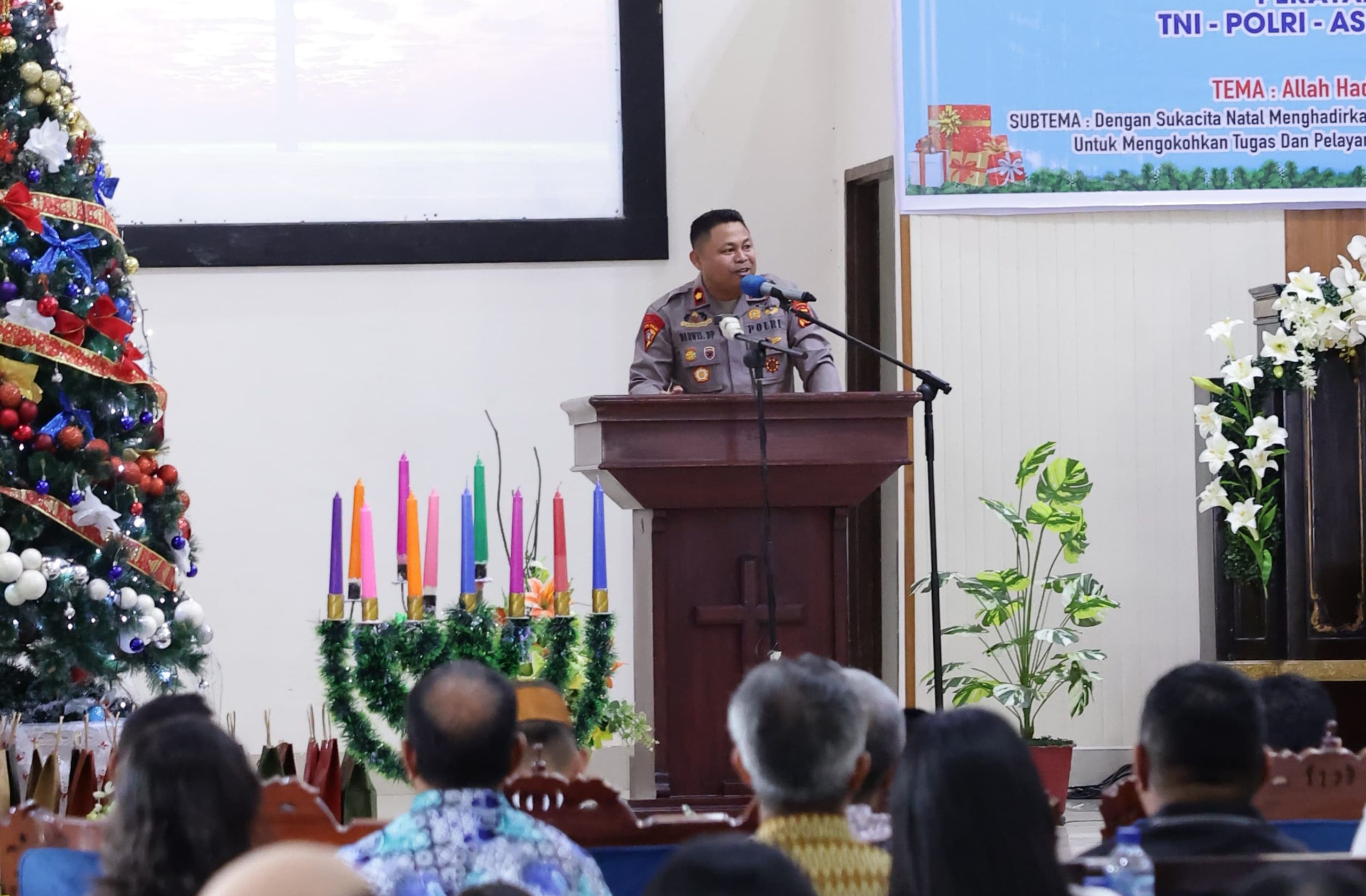 Taruna news.id Kapolres Gowa AKBP Muhammad Aldy Sulaiman, S.I.K., M.Si diwakili oleh Kapolsek Bontomarannu AKP Suhardi, S.HI menghadiri Perayaan Natal dan Tahun Baru 2026 yang dilaksanakan oleh umat Kristiani bersama unsur TNI, Polri, ASN serta masyarakat Kabupaten Gowa di Gereja Oikumene Kertago Borongloe, Jalan Poros Malino, Kecamatan Bontomarannu, Kabupaten Gowa, wilayah hukum Polsek Bontomarannu, Selasa (13/1/2026).