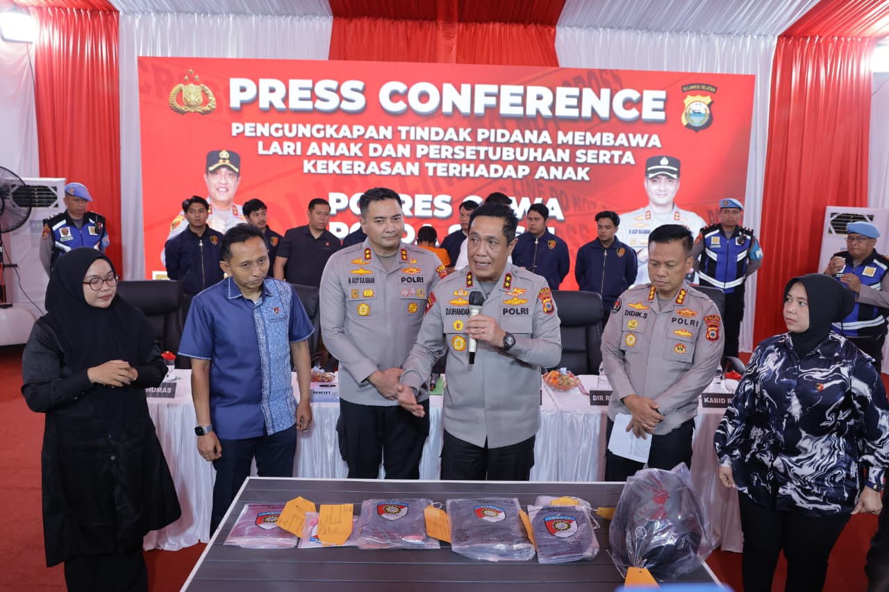 Taruna Tipikor news.com–Kapolres Gowa AKBP Muhammad Aldy Sulaiman, S.I.K., M.Si mendampingi Kapolda Sulsel IRJEN POL Djuhandhani Rahardjo Puro, S.H., M.H memimpin jalannya Press Conference pengungkapan kasus membawa lari anak dan persetubuhan anak serta kekerasan yang terjadi di wilayah Kabupaten Gowa.