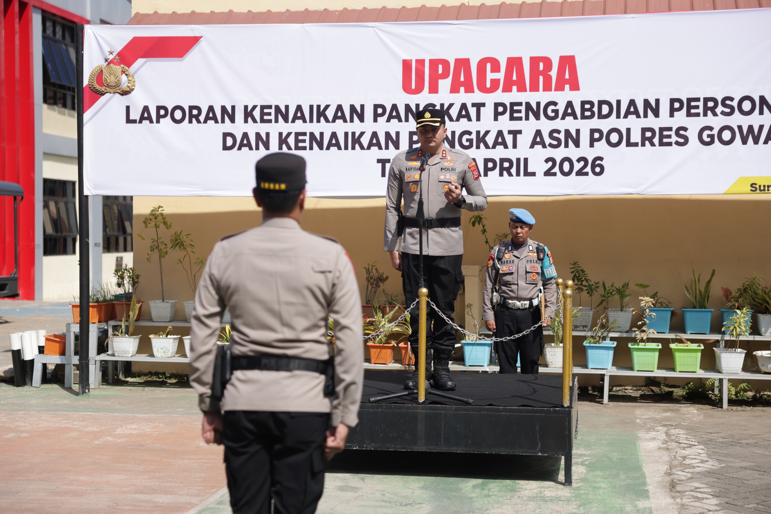 Tarunanews.id Kapolres Gowa Muhammad Aldy Sulaiman, S.I.K, M.Si memimpin langsung Upacara Korps Raport kenaikan pangkat pengabdian Polri dan kenaikan pangkat reguler ASN Polres Gowa TMT 1 April 2026. Kegiatan berlangsung di Lapangan Apel Griya Bhayangkara Polres Gowa, Kamis (2/4/2026) pagi.